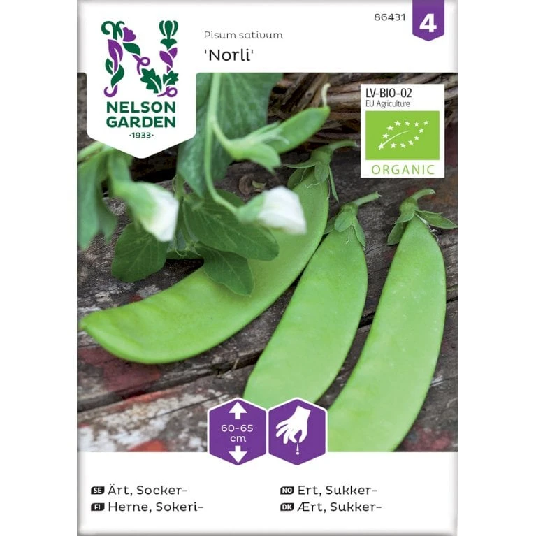 ‘Norli’ er en lav sukkerært, som sætter talrige små ærtebælge, der kan spises direkte fra planten.