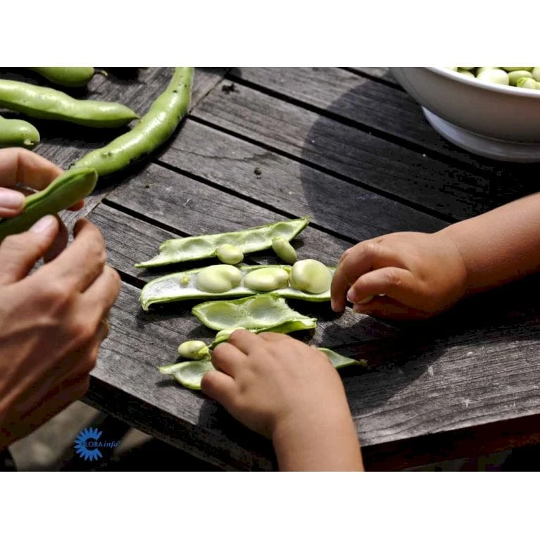 August-september. Små, hvide blomster i juni-juli, som undertiden bliver til de grønne valskbønner.